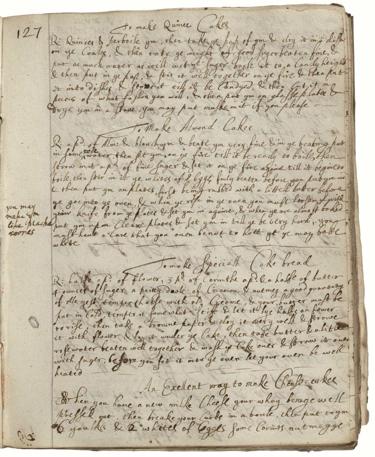 Page from the cookery book of L. Cromwell with the recipe to make ‘Speciall Cake bread’. Folger MS V.a.8, p. 127.