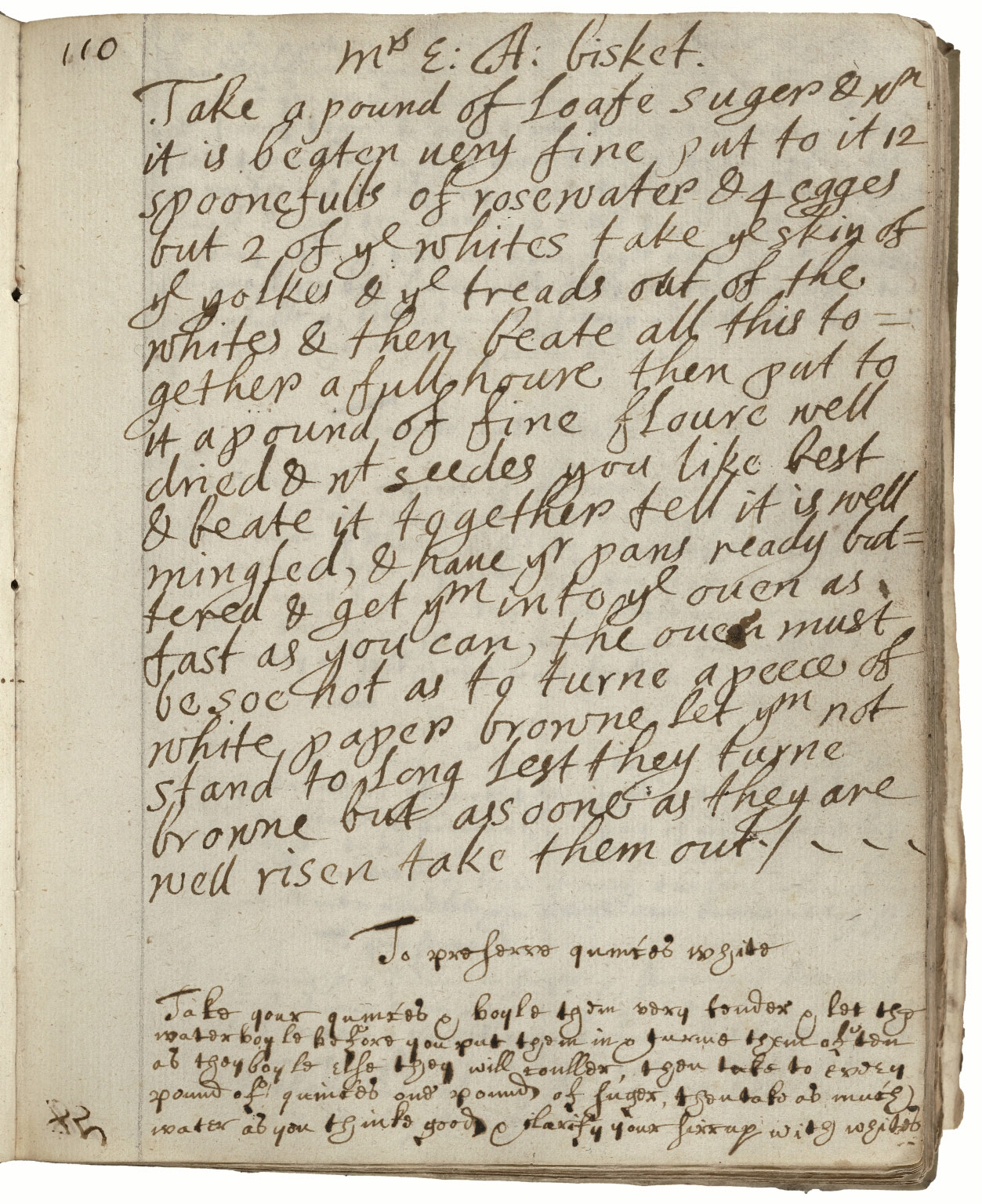 Recipe by ‘Mrs E’ for a biscuit. Folger MS V.a.8, p. 110.